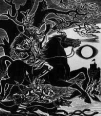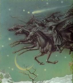 | The moor lies drowned in the moonlight, The mist lies deep and still. A hunter’s moon rides above the trees That crown the crest of the hill. The road is a ribbon of darkness, That threads across the moor, An ink-black ribbon of darkness, That leads to the ale-house door. Hear them now, hear the rushing footsteps, Hear it now, hear his laboured breath! See him now, as he breaks through the hedgerows, See him now, as he races his death! Hear behind him the thunder of hoof beats, Hear the howling and baying of hounds, And now through the mist gently parting, See them rushing to run him to ground. Through the mist glowing with the moon-silver, From the darkness of some other world, Rides the foremost of all the Queen’s huntsmen, From his forehead the dark antlers curled. To punish the high crime of trespass, His mistress has bidden him ride. She’s sent forth the Wild Hunt’s legions, To punish a young mortal’s pride. For he’d entered my lady Queen’s chambers, Dared to spy on her there as she bathed, Thought he’s ‘scape from the glamours of Faerie, Return home to England unscathed. He thought not of guardian enchantments That showed her the place where he hid. She screamed out a demand for vengeance, Vengeance for all that he did. So he ran for the Hollow Hill’s entrance, Through the hallways of echoing stone. Ran to escape to the mortal realm, Beyond the reach of her throne. Titania summoned her Huntsman, Called for her Huntsman, Herne, Told him to track down the mortal, That for his crimes he should burn! Swiftly they saddled their horses, Swiftly prepared them to ride, Swore that they’d track down the mortal, Wherever that young man should hide. See him now as he staggers for safety, See him now as he runs for the door. See him now as he slips on the pavement, And lays himself out on the floor. See the white hounds closing upon him: White teeth and tongues deepest red. Our lad scrambles to find his feet: If he stays down, he knows he is dead. See him now as he rattles the door-latch, Hear his cries as he beats on the wood. Watch as he rattles the heavy oak, That he’d open if only he could. From her bed climbs the inn-keeper’s daughter, Seeks for a lantern to light, Pushes back her long red hear, Peers through the glass at the night. Hoof beats ring on the cobbles. The huntsmen draw reign and dismount, Calling away the baying hounds, Their reward beginning to count. Down the stairs runs the innkeeper’s daughter, Shoots the bolts back, opens the door. Into the inn falls our mortal boy, And collapses onto the floor. In the doorway stands Herne the Hunter, Through the doorway he starts to stride. Baffled, he stands on the doorstep, Unable to reach the inside. In the distance now hear the cock crow: Dawn’s light will soon paint the sky. Away rush the Hunt to the Hollow Hills, One last glare Herne’s only goodbye. The tavern wench turns to the mortal lad, As he lies in his place on the floor. His eyes are fixed on a horseshoe: Cold Iron fixed over the door! |